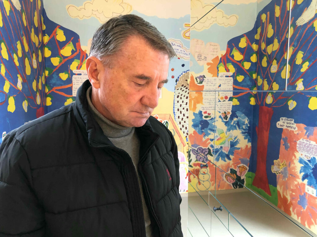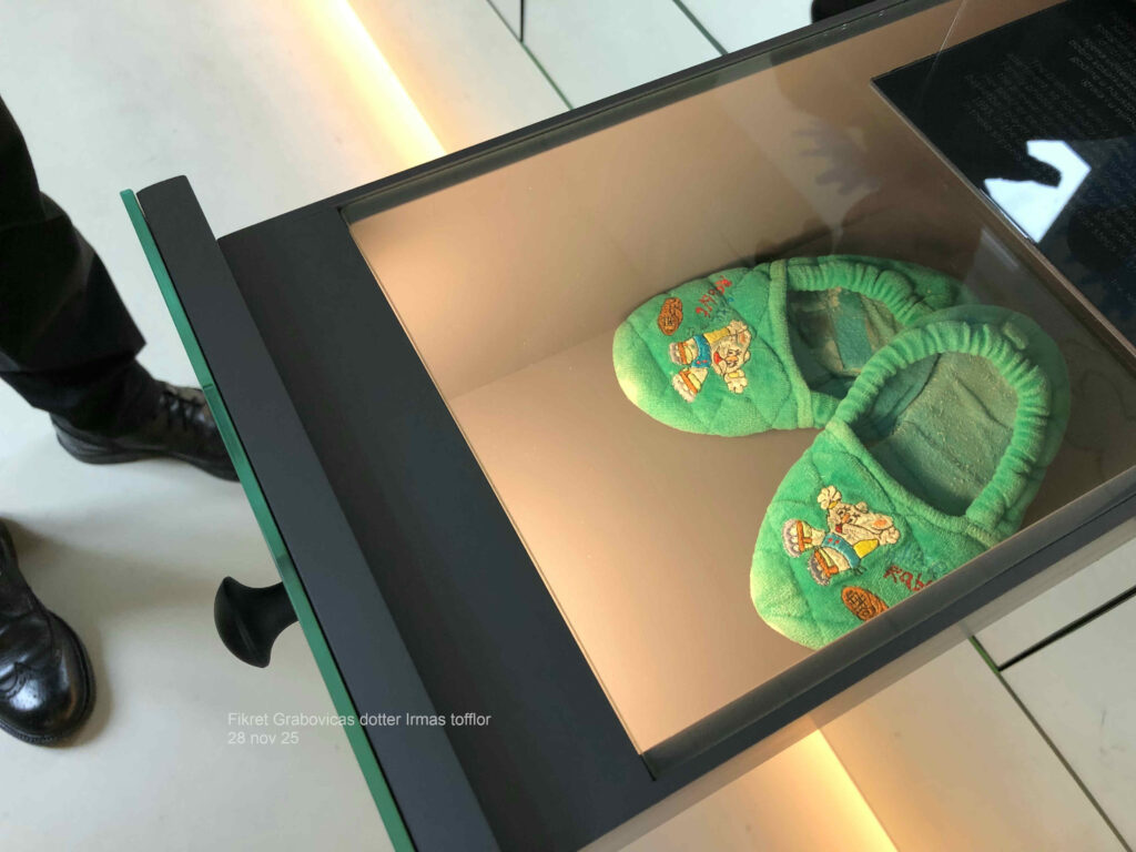 Fikret Grabovica är ordförande och fick sin dotter dödad i en granatattack. Han drar ut en låda med glaslock ur ett utställningsskåp och under ligger hennes tofflor.